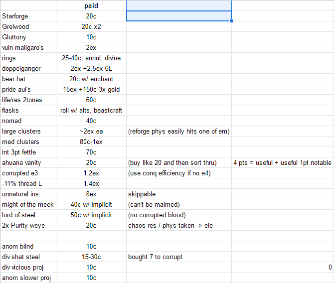 | Shattering Steel's been pretty fun Posted: 06 Sep 2021 01:11 AM PDT Gave point blank SS a go after Neato's video and it was fun enough I dumped ~40ex into a scion variant of it. I'm really happy with the build because the gear is offmeta and so quite cheap for what it does, and most of the upgrades are in affordable chunks. 5m dps/proj x whatever overlap seems realistically attainable by mid-90s. I think it's a solid all-rounder build, but mapping can be a bit slow compared to other builds since you've got PB and the range is crippled - still, it's p comfy. Keeping the ammo topped up is the most annoying part. I leveled with LMP in a 4L, until I replaced it w crit strikes in the 6L. I recorded a couple videos - they're not guides, just me doing 2 maps so you can kinda see. The first one is 2h with a Starforge. Starforge is really comfy, a bit of aoe, life, big thunky base damage, and phys can shock. It's also cheap cuz nobody uses it anymore. It feels much nicer for mapping than dw since you just dump a single large hit and move on, and you're not running out of ammo every 1.5s. The second one is dw with 2 grelwoods. I had originally planned my vers of the build around this but as you can see you run out of ammo super fuckin' fast and it's awkward. Like you actively have to take care to not hold the button down or you jump into packs with 0 ammo. In that respect, pob's dps shouldn't be relied upon because it doesn't factor in reload time, and you spend more time reloading with a low-hit high-aspd comp. The average hit should be given more weight. But dw is super comfy on bosses since you can just dump and bounce around while it reloads. I also prefer 2h over +4 proj because the sound effect crash occurs with SS' multi proj overlap too (notably around prox shields, where sfx stack/overlap). It just crashes less for me on 2h. I think it's viable as a league starter, but I would probably start Neato's build with BM + Mortal Conviction if so. It'll work just fine with a junkier 2h axe/sword. Disfavour, Terminus Est, idk. I used that lvl 30-ish axe with vagan's + culling until 68. Maybe not SSF friendly? Lord of Steel is practically req'd for QoL and the Fortify lab enchant is super comfy too. Gear Breakdown cost: https://harle.s-ul.eu/jjnpdtSl Most of the $ is in the Pride Aul's + Unnatural Instinct. These are both 100% skippable, but then you need to pickup BM+Mortal, so it's a minmax thing I splurged on. For the rings, I looked for good rings in the 1-2ex range, found none, and then looked for 4/6 rings that I could annul in the 20c range. 1/3 chance to get a good ring for 25c is def worth. mfw I annuled t1 int. jewels - search - if missing 45+ int on 1 ring suffix, need 20 on tree + 25 from jewels. Also need 11% impale chance over 2 jewels, life %, optionally damage. Gluttony vs Nomad - Nomad just way better I think (also can throw $ 2x corrupting for pride%), but Gluttony req'd if grelwood for damage consistency since +4 proj reqs you to get hit. The culling is kinda whatever. 2h chunk damage makes it so culling is only really nice to have for shaper/sirus etc, since it won't matter much for map bosses if you remember to press Sniper's. Body - Doppelganger Guise - underused af and the destroyed on kill is great qol. Carries hard imo. Maligaro's gloves - easy 300% multi, and because it's a unique ppl will vaal them, so it's relatively easy to get vuln in trade league, which gives a lot more ring flexibility. Boots - since there's so many uniques we really need life/res, so these're a catchup slot. 80% avoid frozen, since 20% from tree. Watcher's Eye - I just got a double purity one bc theyre cheap and you get ~45-50% chaos res and max 12% phys taken as ele, and being a softcore dodge build we really like both of those things. Bear hat - was the cheapest one with fortify enchant and it seemed pretty okay. Misc Sniper's Mark is huge dps and I forget to press it all the time Since Pride has no reservation, we can link it to Arrogance for the aura% with no drawback. If going BM/Mortal, swap hypothermia out of the 6L since no skitterbots. Anc prot - maim - blind <- can swap blind for cull overleech is awesome qol with VP with chaos res capped, can use Forbidden Taste enchanted with "when you take a savage hit" for lazy healing too Leap slam is nice since it stuns stuff at full hp [link] [comments] | ||